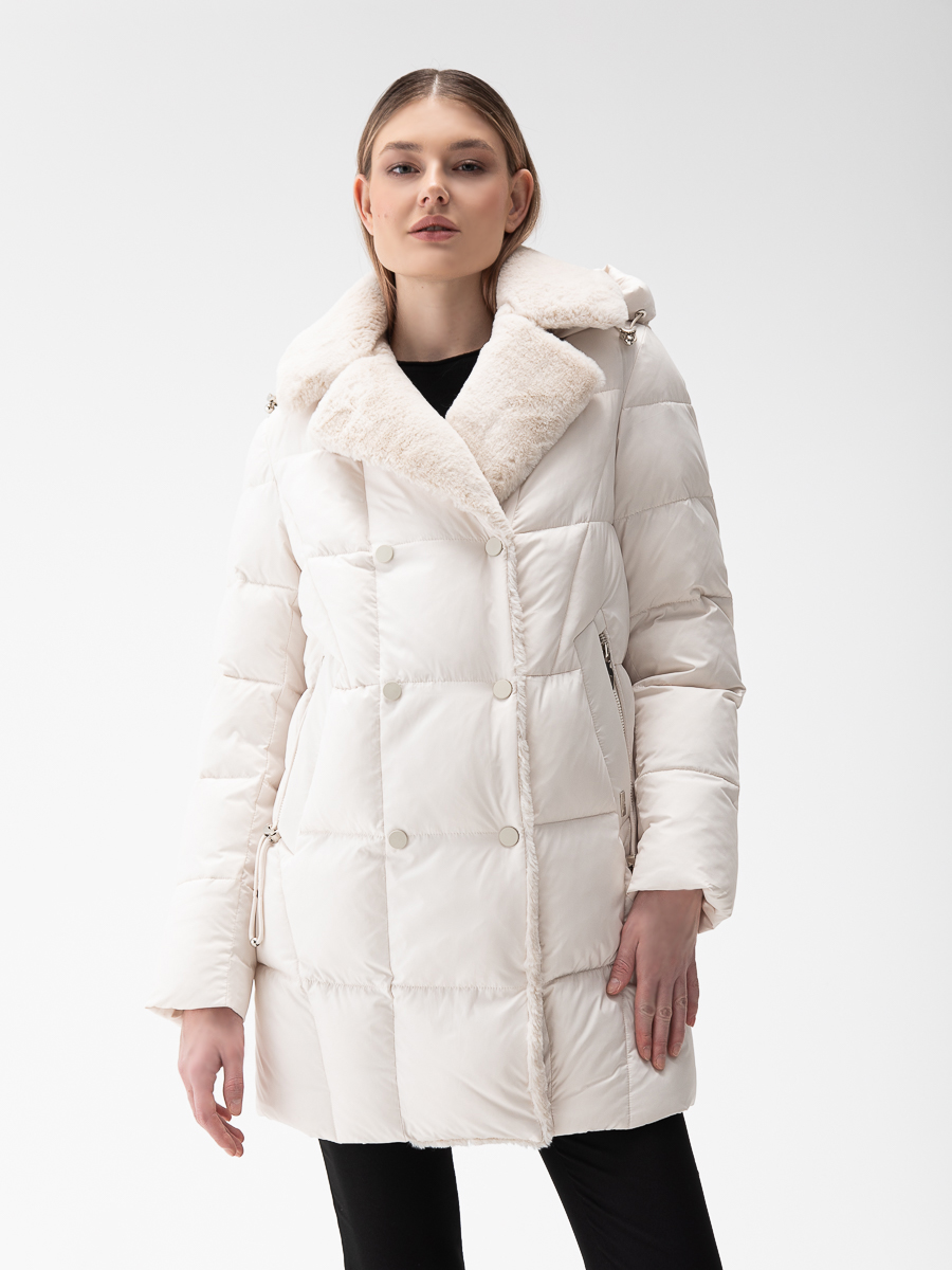 Крой воротника - съёмный капюшон, отделка эко мех