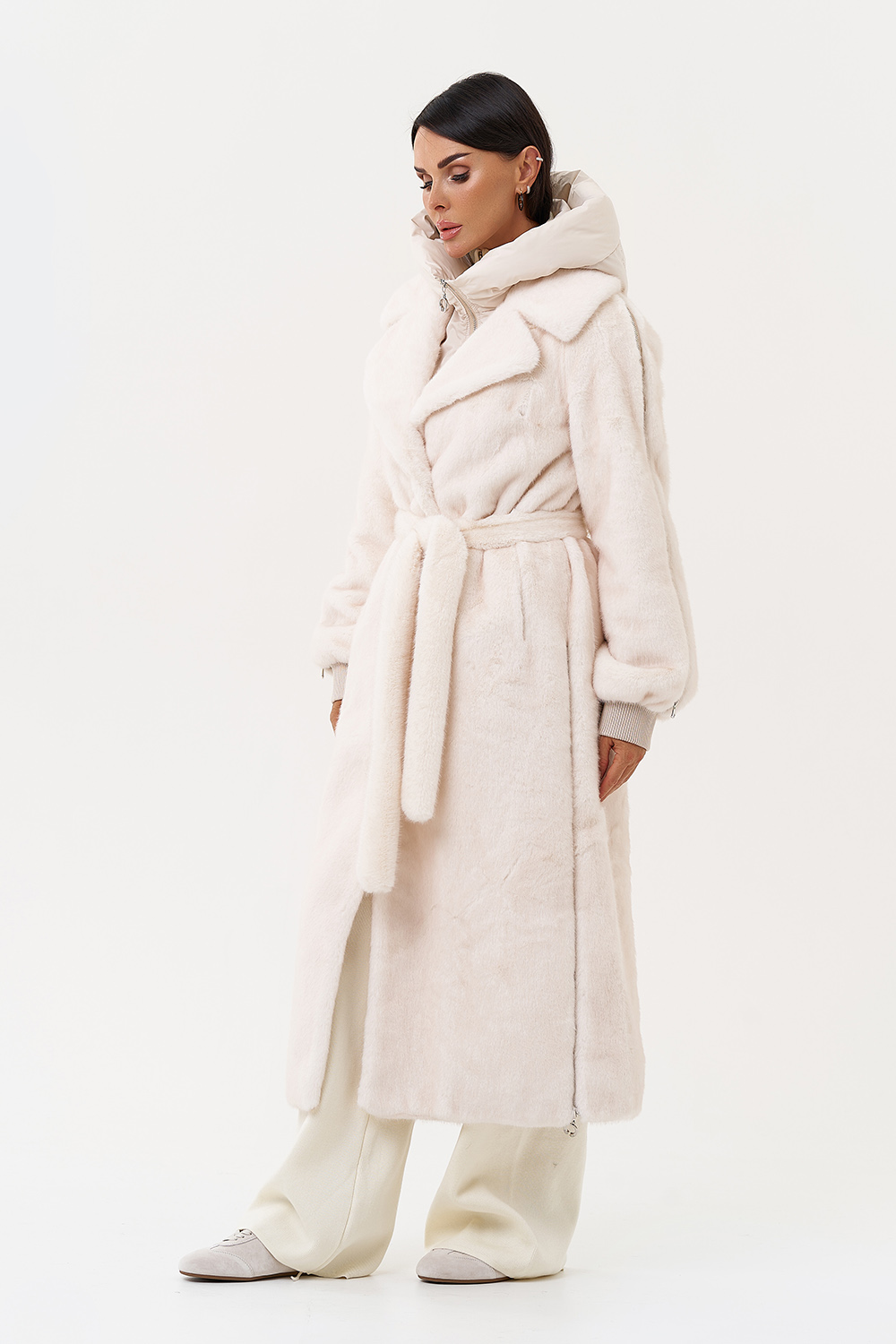 Фасон - прямой Длина изделия - 120 см Цвет - светло-бежевый (молочный) Материал - экомех Состав полотна - полиэстер 100% Подкладка - полиэстер 100% Вид застежки - крючки, пояс Вид ворота - съёмный капюшон, английский воротник Фасон рукава - реглан, длинный |