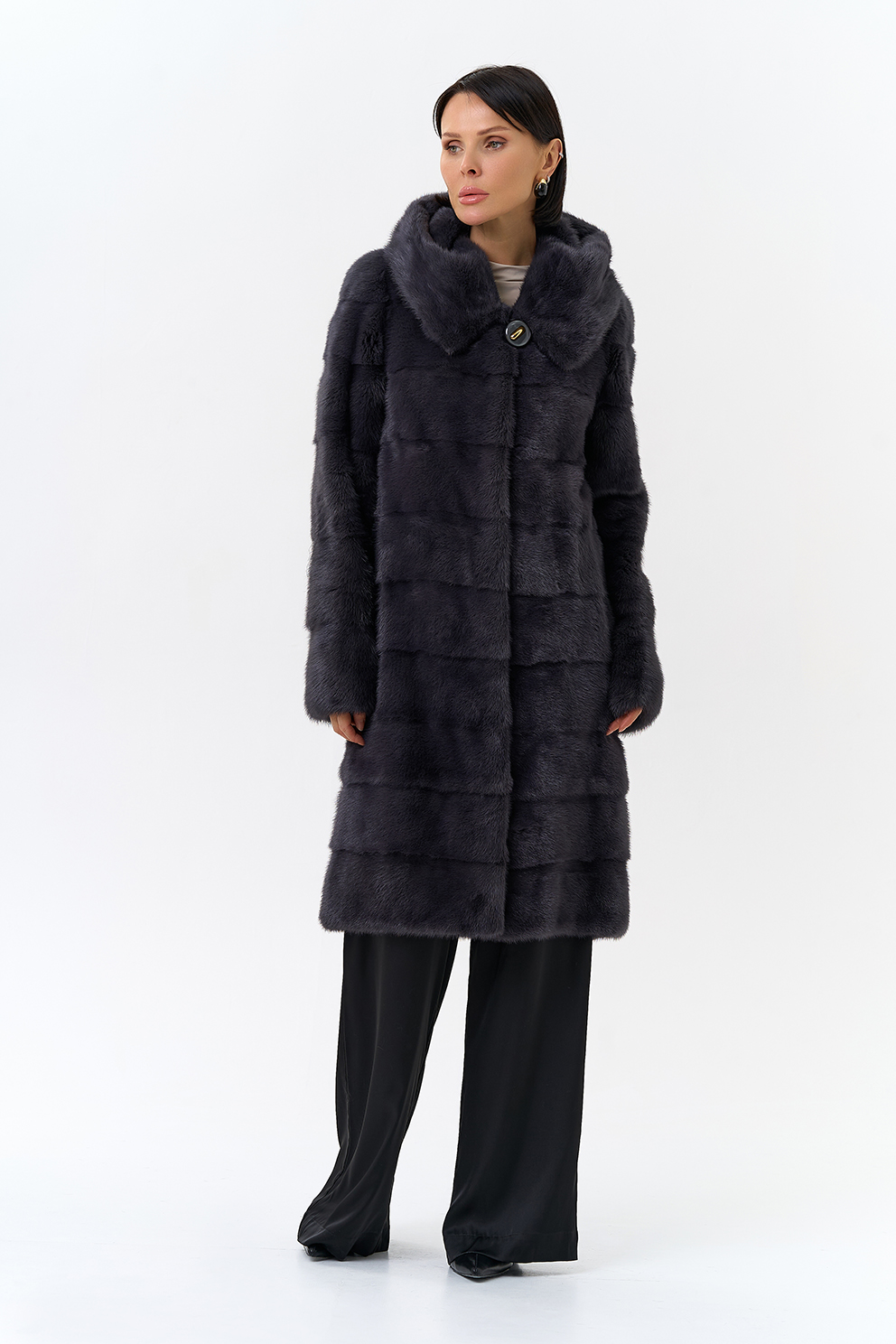 Норковая шуба трансформер в поперечном крое с капюшоном в цвете графит. Каждый день новая модель! Длина изделия трансформируется до 80 см,а рукав до длины ⅞. Шуба дополнена аккуратными пуговицами и крючками.